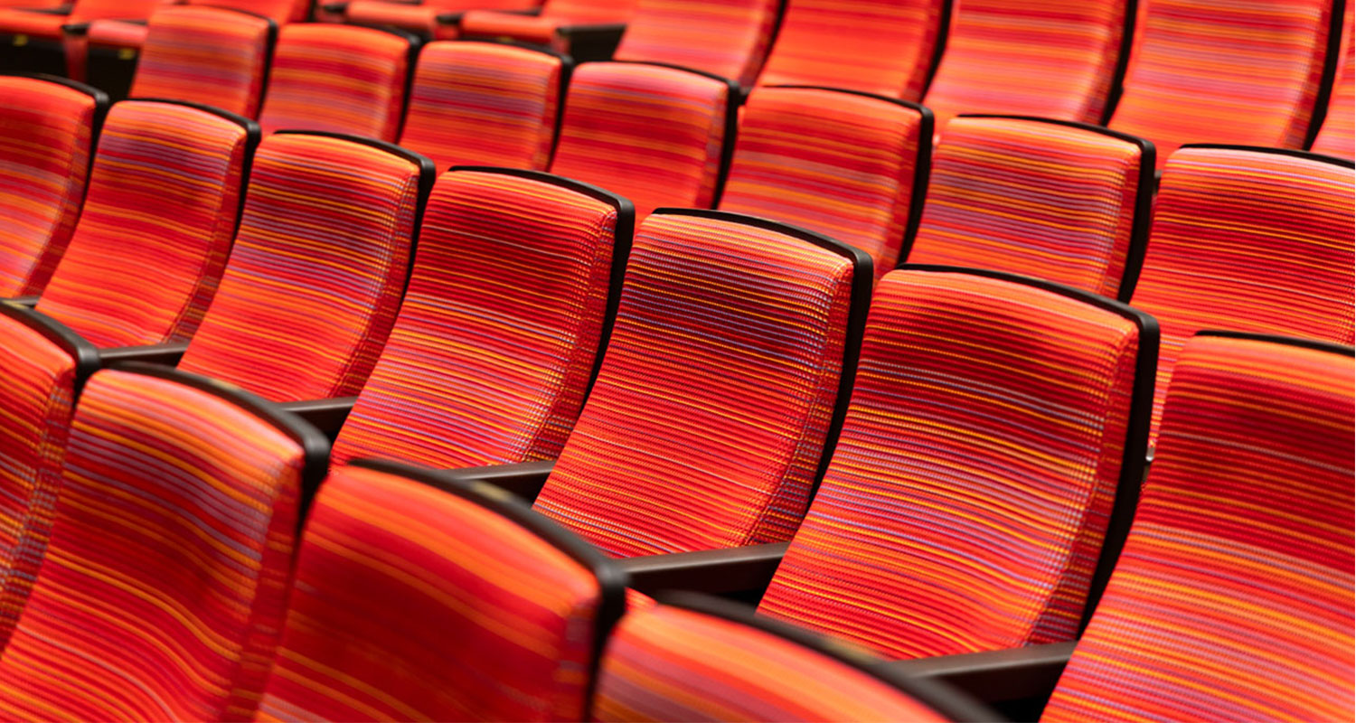 1リピートの柄を大きくして張り分けることで、座る席によってさまざまな表情が現れるしまんとホールの張地デザインは、全国的にも珍しい。川の水面のゆらぎのようでもあり、川を大事にきれいに受け継いでいくという、市がキャッチコピーとして掲げる「川とともに生きるまち」を、客席から自然と感じることができる。