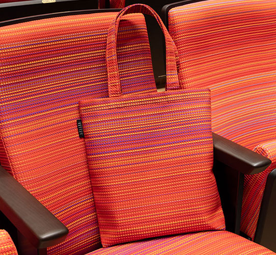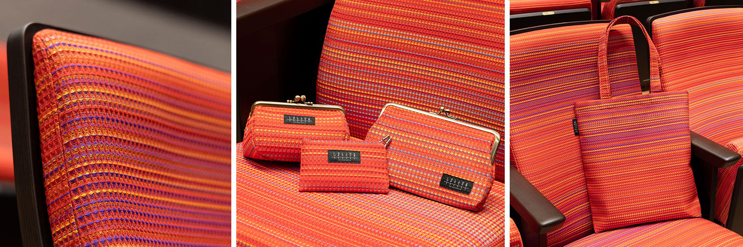 竣工式や開館プレイベントなどの行事では、イスの張地を使ったバッグ、カードケース、ペンケース、ポーチなどのオリジナルグッズが配布され、グッズを目当てに竣工式に参加した市民もいたほど、非常に好評だった。客席イスの張地は、不特定多数が繰り返し使用する環境下にふさわしい高い耐久性を持つ。形やサイズもさまざまで実用的なことから、関係者からも「どこで買えますか?」と声が上がった。伊豆氏も「これらのデザインは、宣伝やシティプロモーションを兼ねて引き続き活用していきたいと考えています」と希望を込めて語る。