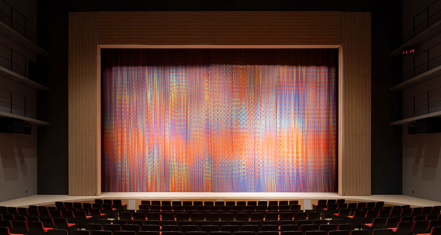 ホール内装の縦横のゆらぎに調和するデザインを目指した、引割昇降緞帳