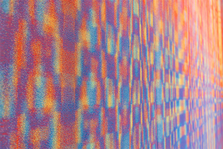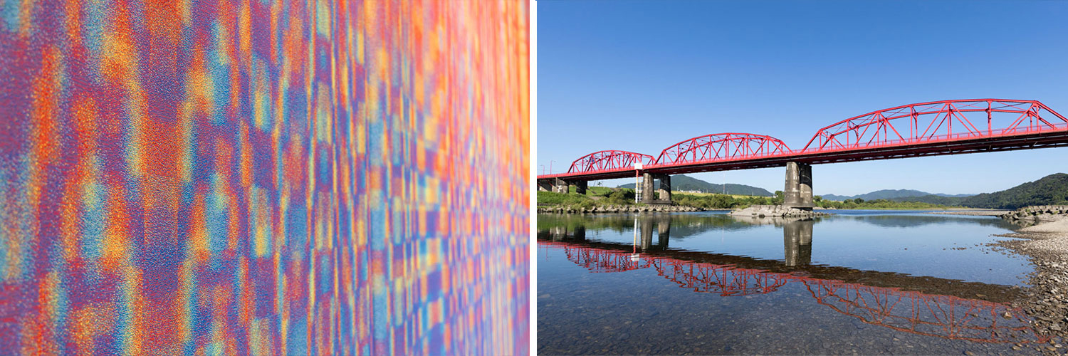 市からは、「四万十市らしい象徴的なデザインによって市民のアイデンティティを高めたい」「目にする度にポジティブな気持ちを持てるような緞帳にしたい」というリクエストがあった。また、設計事務所からは、「客席の横方向のゆらぎと、ホール壁の木のルーバーの縦方向のゆらぎ、その両方に調和するようなデザインにして欲しい」という要望があった。両者を取り入れながら製作を進めたのが、FABRIKOである。引割幕は、緞帳に比べ、そのドレープによって柄が見えにくいという課題があるが、ドレープがあっても違和感がなく、つなぎ目も目立たないような抽象的なパターンを提案し、採用された。市民にとってなじみある心象風景であり、アイデンティティでもある赤鉄橋が映る水面のゆらぎと煌きを表現している。