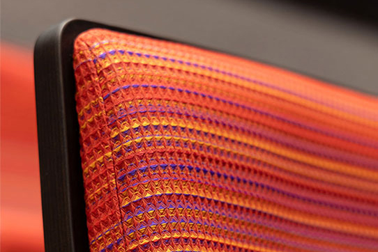 四万十川をモチーフにデザインした赤色のイス張地、