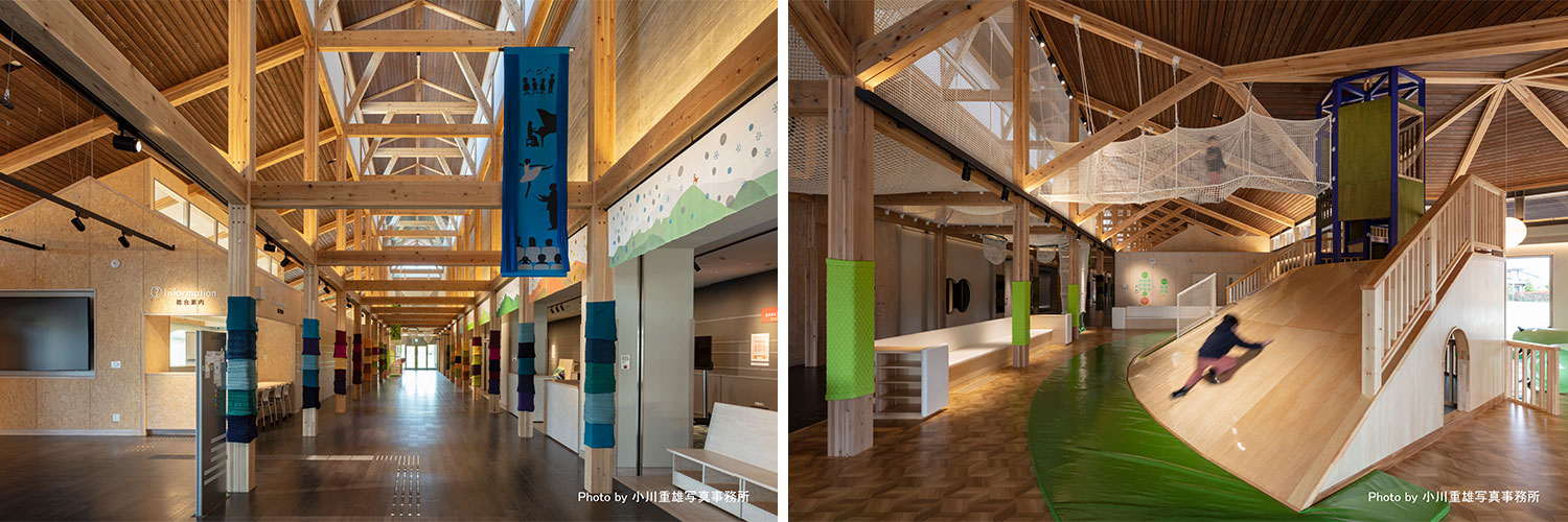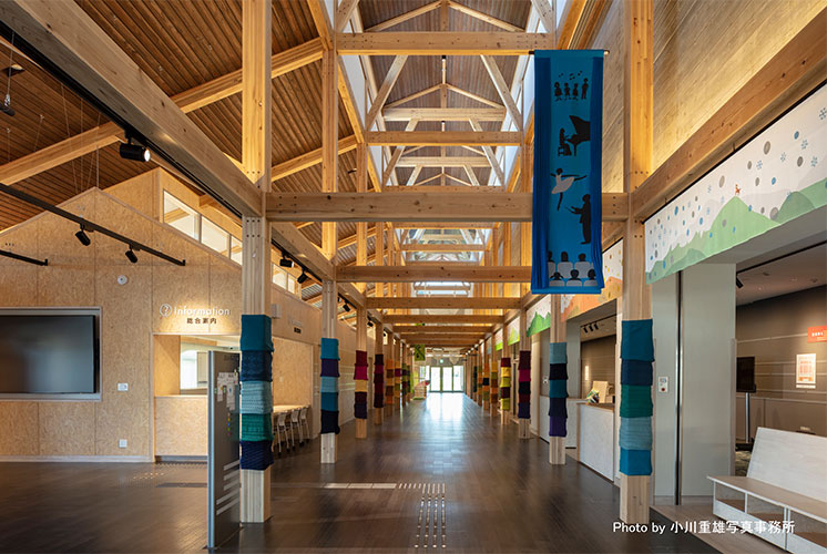 (長谷川氏) 複合施設「ラポルテ五泉」設立への提案にあたって新潟県の株式会社鈴木設計企画さんから「一緒に組んで出しませんか」とのオファーをいただき、ありがたく共同企業体制での参加というスタートをきりました。目的は、五泉ニットを含めた産業振興、劇場、冬は積雪で遊べなくなる子どもの遊び場を屋内にも作りたい。みんなが集まって活動できる場所を作りたいという思いが根底にあることを理解しました。ただ、これを全て実現するには、床面積が足りない。そこで、それぞれの空間を区切らず、その時々に応じて空間をフレキシブルに使えるよう、販売エリアは固定の壁で仕切らず可動の間仕切りに。また、ホール内も移動観覧席を採用。一部の壁は可動にすることでロビーや中庭と一体での利用も実現しました。空間の使い方を限定せず、「未来の使い方をみんなで考える」という私たちからの提案です。