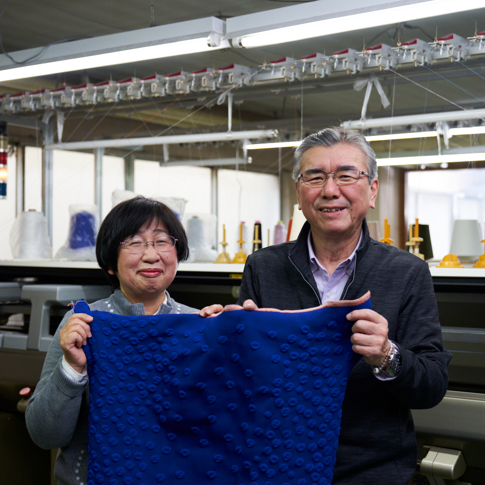 私共ニット製品製造の会社「嘉村工場」は、私、嘉村満智子の五泉出身である父母が初代で開いた会社です。“人がやらないもの、技術が難しいものを作る”がモットーで、高度な技術が必要な製品を早くから考え、実行していました。その精神を引き継ぎ、アパレルニット製作が私共の主要事業ですが、今回、いつもとは違う劇場イス張地の製作を試みました。オーダーにお応えするために試作・やりとりを重ね、様々な苦心はありましたが、新分野を開拓できたものと感じています。また、イスが並んだ様子を目の当たりにして、イスとニットの一体感、新たな挑戦の喜びとともに「いい仕事をご一緒させていただいた」と夫婦・スタッフのみんなで、そう実感しました。