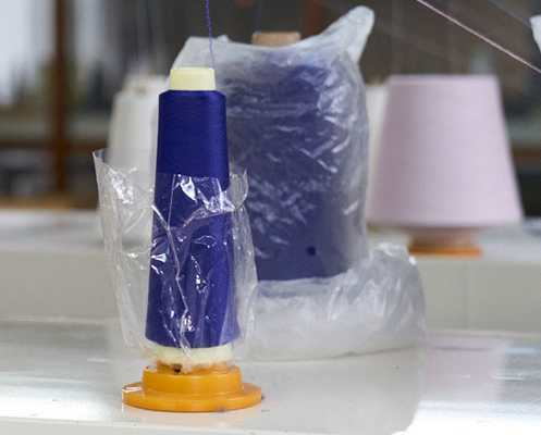 (澤村氏) 熱で収縮する糸です。編み上がった後、高熱の蒸気でギュッと縮めて厚みと強度を高める作り方です。糸や密度などを調査し、製作していただく嘉村工場さんにお伝えしました。デザインは、ご要望の2つの方向性で提案し検討。ひとつはニットらしさを全面に出し「セーターを着たイスに見える」がテーマの「ケーブル編み柄」。もうひとつは採用された、五泉の豊かな水、水の流れ、透明感。見る人によっては雪や桜にも見える「花雪柄」です。