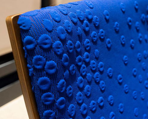 色に深みを出すため、微妙に異なる青系の糸を2色使用し、ニットならではの凹凸感を浮かび上がらせ有機的なゆらめきを際立たせます。そして飲食利用の可能性もあるということで、イスの背はニット張地、座はレザーでご提案しました。何度も五泉に足を運び、試作検討を重ね、まずは、物性試験をクリアした上で要望のデザインをきちんとカタチにしていくことを大切にして進めました。