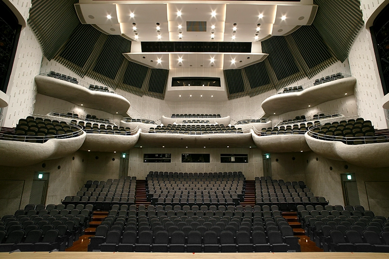 瀬戸内海を望む立地にある本施設。ホール内の特徴的なバルコニー席は国東半島の棚田をイメージしています。