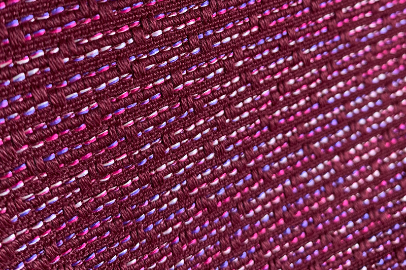 市民会館のイス張地は、その趣を感じられる落ち着いたピンク系をベースに、光沢のある多色の糸を織り込み、艶やかに移ろう春の表情を描き出しました。