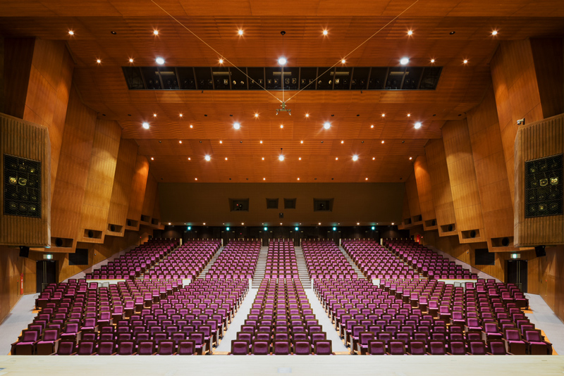 桜のように上品で華やぎのある張地は、劇場空間に落ち着きと高級感をもたらし、市民会館を訪れる人々のハレの日を彩ります。