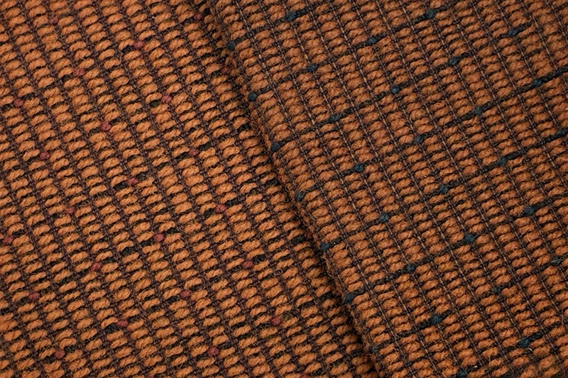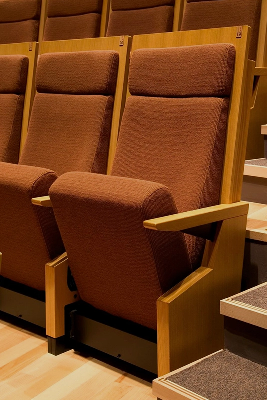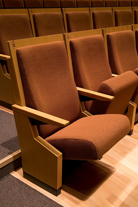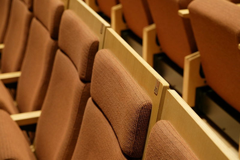 色は小ホールよりもコントラストをつけた配色のため畝の凹凸がより際立ち、同じ織り方でも印象の異なる仕上がりです。施設へお越しの際は、小ホールの張地も併せてご覧ください。