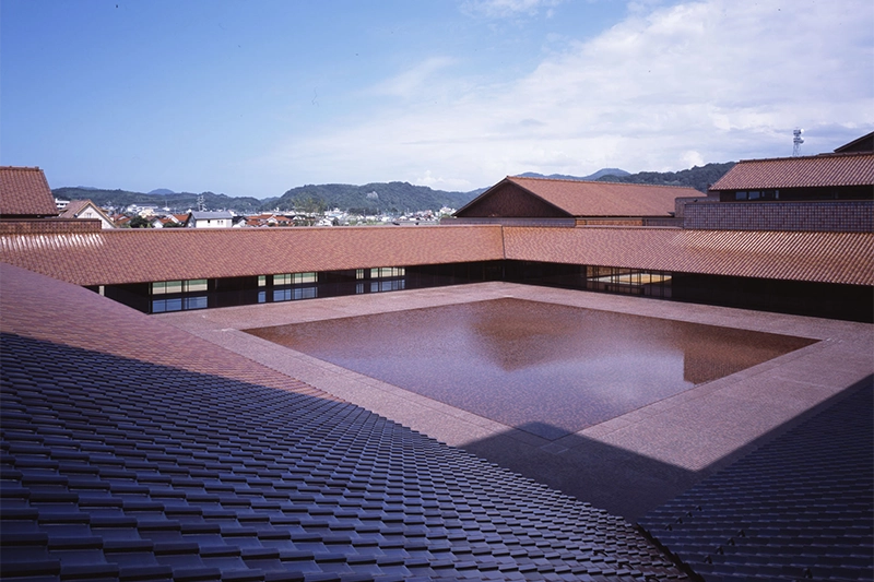 「グラントワ(Grand Toit)」はフランス語で「大きな屋根」を意味し、その名の通り、建物全体を覆う屋根と外壁には約28万枚もの石州瓦(せきしゅうがわら)が使用されています。地域の情景として今日も親しまれている、石州瓦がつくり出す町並みと調和しています。