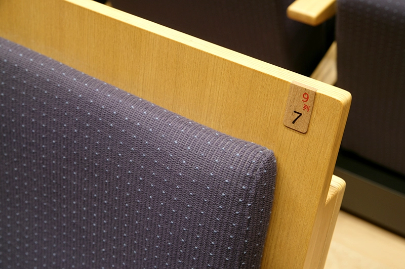 この石州瓦は、釉薬によるガラス状のコーティングによって、色が変化しさまざまな表情を見せます。小ホールのイス張地は、空の色を映し石州瓦が青く染まる様子を捉えた、FABRIKO(ファブリコ)オリジナルのデザインです。