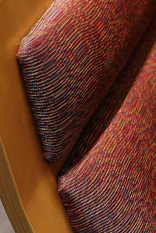色は、炎や生命力をイメージさせる赤系をベースに、様々な色糸を織り込むことで深みのある赤を表現。客席に近づいて見ると、炎の力強さ、十日町の自然や歴史に根ざした温もりが感じられます。